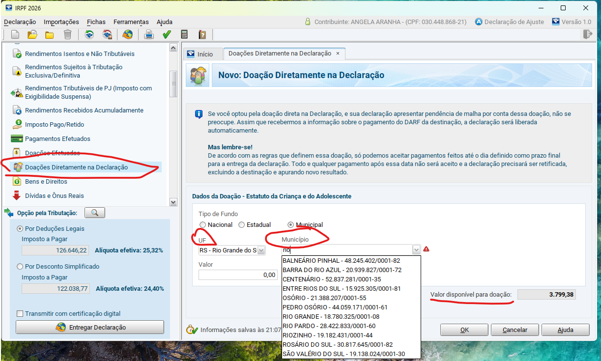 Entrando nessa ficha, você escolhe até o município que será beneficiado com sua doação. Eu gosto de doar para cidades muito pequenas e afastadas dos grandes centros.
