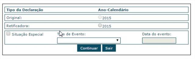 Rotineiramente, o profissional ou corretor PJ deve preencher a primeira tela indicando uma declaração do tipo “original”, sem situação especial e sem indicar nenhum “evento”.